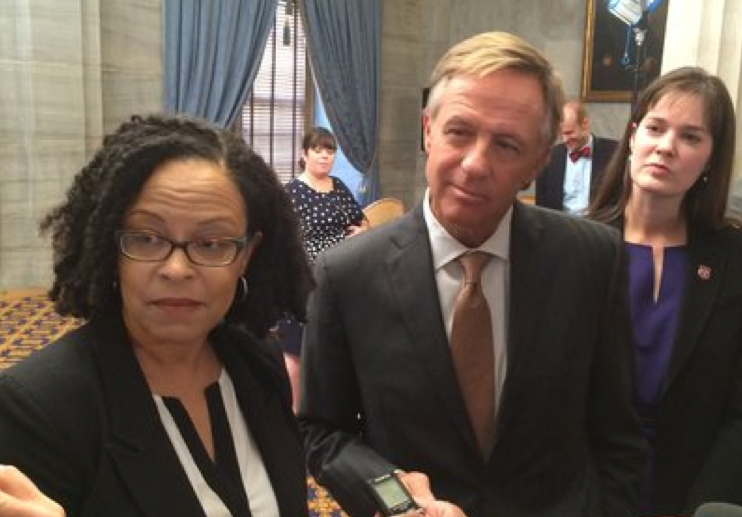 Malika Anderson (left) new superintendent of the state’s Achievement School District, answers questions at a State Capitol news conference with Gov. Bill Haslam and state Education Commissioner Candice McQueen.